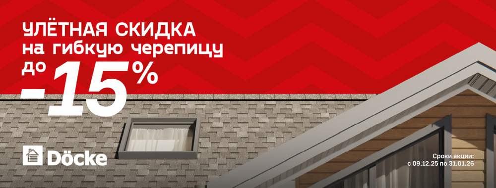Только с 30 октября по 31 января 2026 декабря дарим улётную скидку до 15% на всю гибкую черепицу Döcke. Гибкая черепица сочетает долговечность, эластичность и экологичность, выдерживая экстремальные температуры и осадки. Однослойная гибкая черепица - https://www.docke.ru/roof/ Ламинированная черепица - https://www.docke.ru/lamroof/ Не упустите шанс сэкономить! Гибкую черепицу Döcke можно приобрести у официальных дилеров и партнеров по всей России